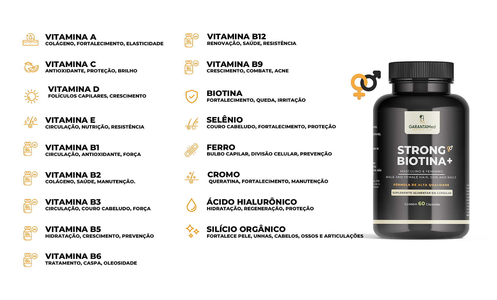 Se busca um produto de alta tecnologia para incluir em sua rotina, capaz de tornar seus cabelos, pele e unhas mais fortes, bonitos e saudáveis de forma natural, o STRONG BIOTINA+ GARANTAMed foi feito pensando em pessoas exigentes que busca constância e regularidade no resultado de seus cuidados pessoais.