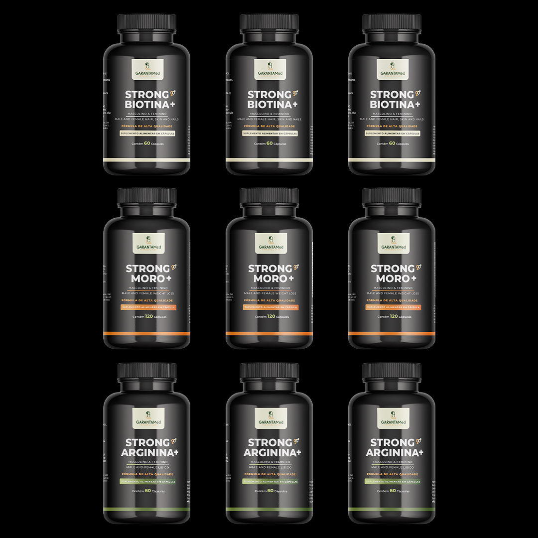 STRONG BIOTINA+ (Cabelo Pele Unha) STRONG MORO+ (Emagrecimento) STRONG ARGININA+ (Libido Masculino e Feminino) Combo p/ 3 meses , 3 frascos de cada